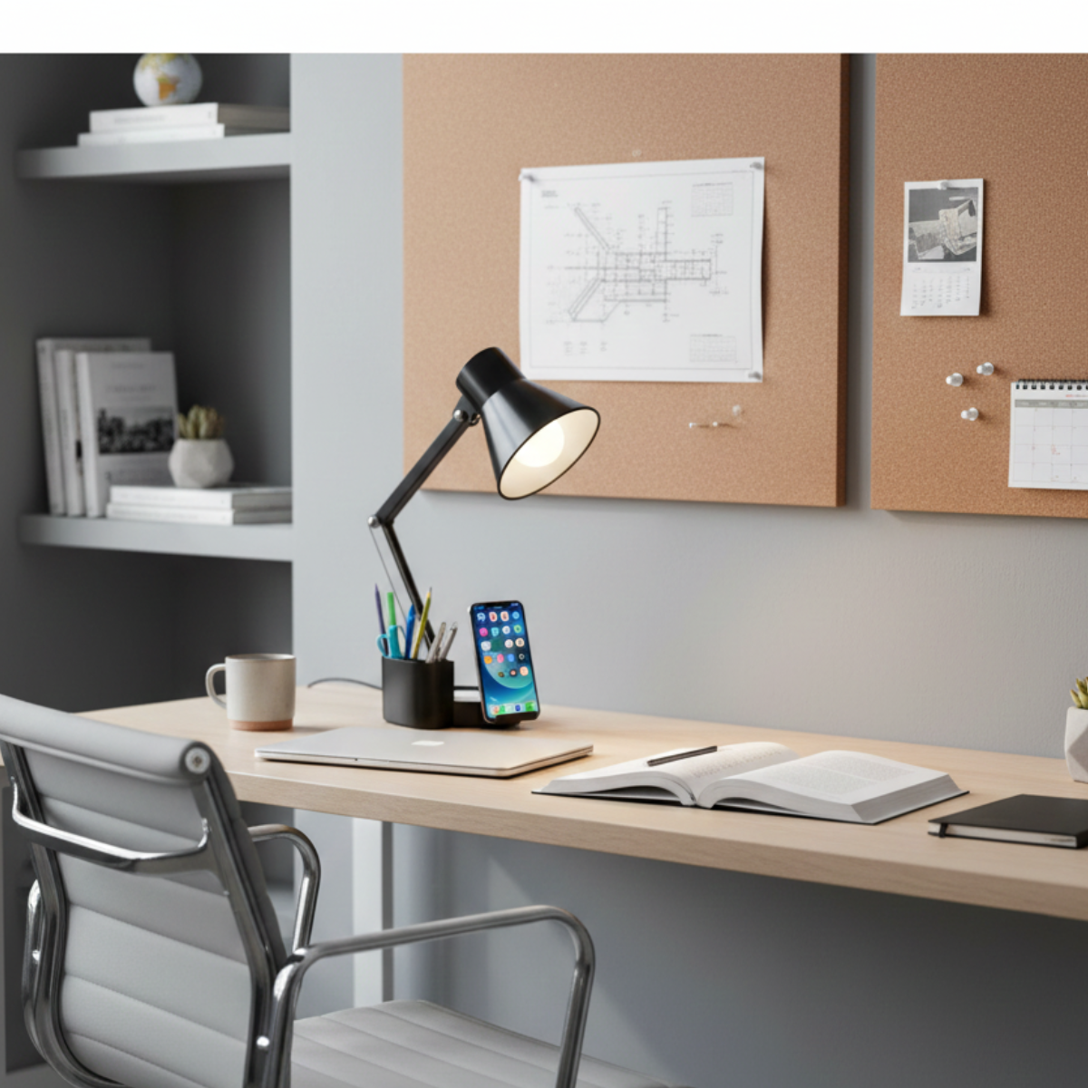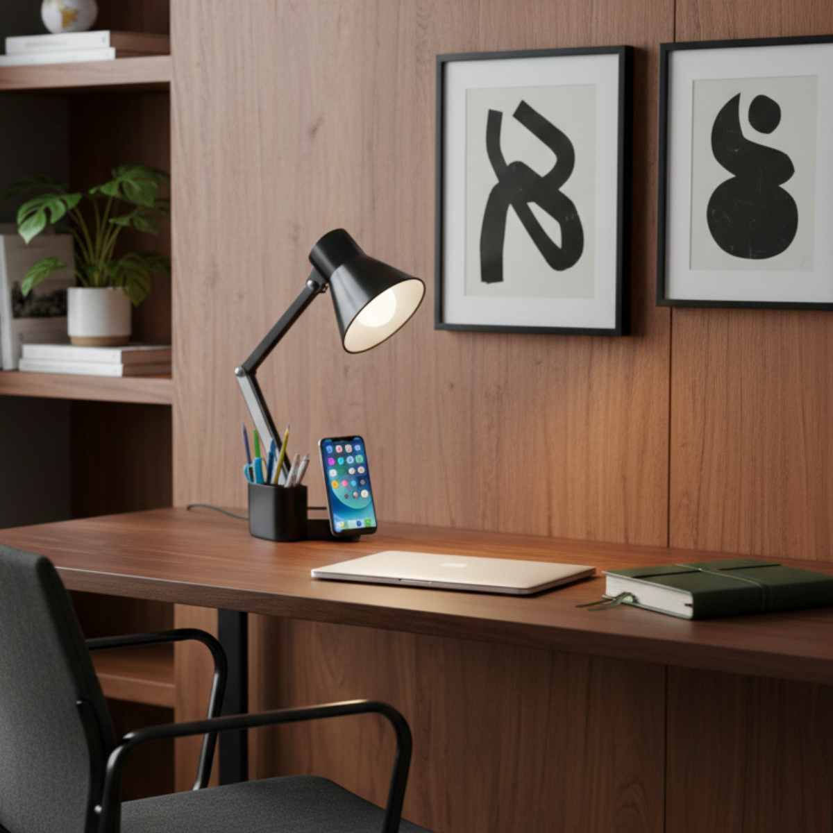 Luminária de Mesa Articulável 3 em 1 – Iluminação, Organização e Suporte Celular
